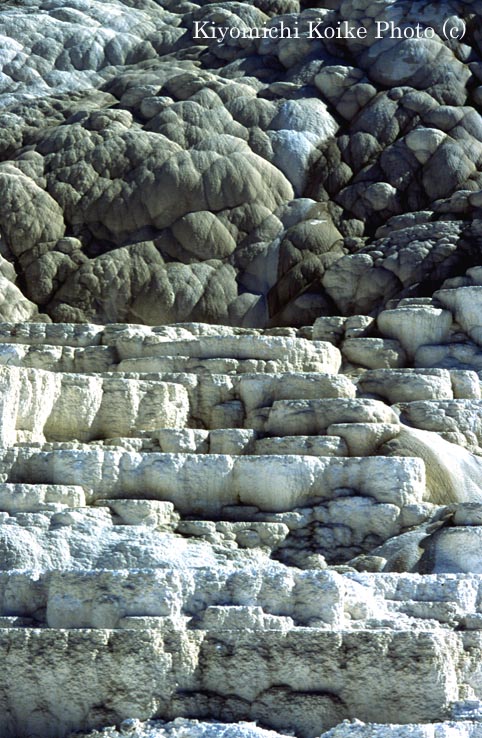 マンモスホットスプリングス。1年に30〜60センチ成長するといわれているテラスは訪れる度に成長を