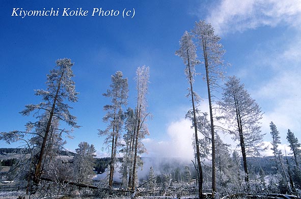 霜が下り間欠泉の熱湯だけではなく公園内を流れる河川の