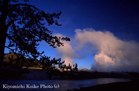 霧状の湯気が幻想的な情景をみせ、あちこちで吹き上げられる間欠泉の蒸気が日中よりも激しくそして